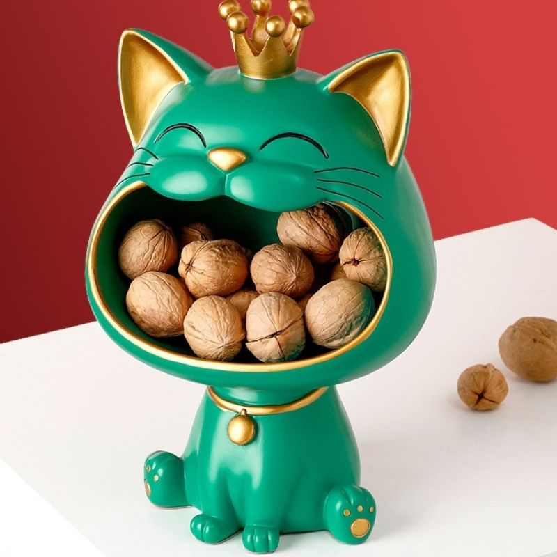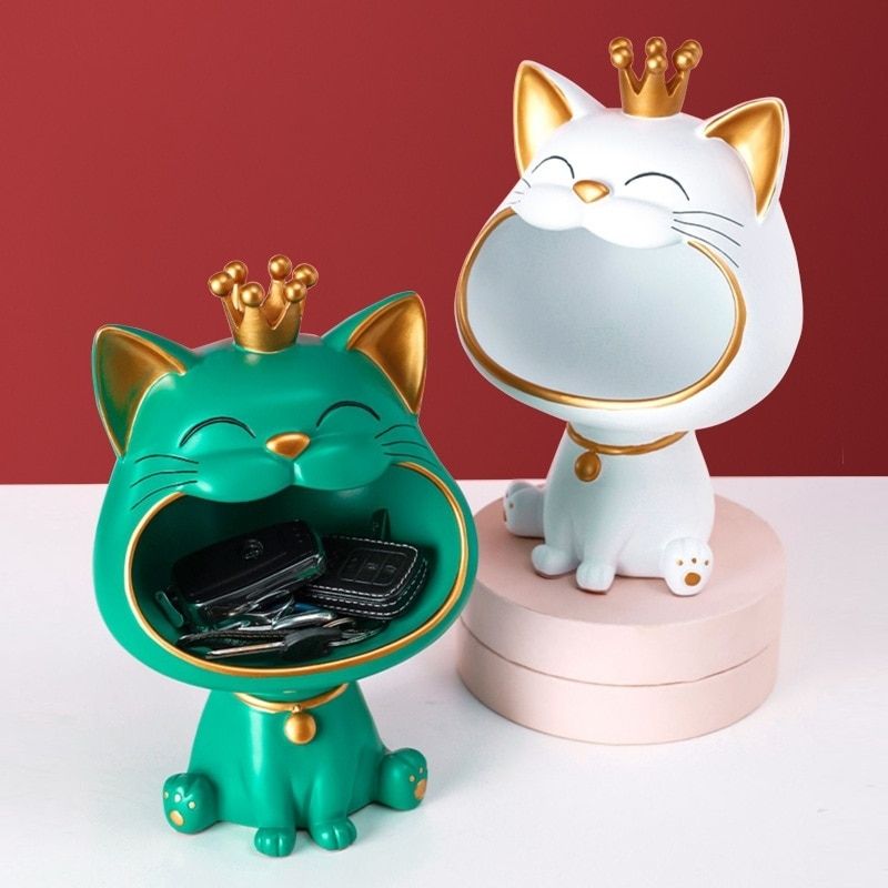 Ce modèle fabriqué en résine naturelle apportera beaucoup de cachet dans votre décoration d'intérieur. Cette sculpture représente un petit chat assis avec une grosse tête et un air très joyeux. Ses couleurs vert et or apporteront beaucoup de peps dans votre pièce. Sa forme vous permet d'ajouter de petits objets dans la gueule de l'animal. Vous pouvez poser ce modèle sur votre table de cuisine ou le meuble de votre entrée par exemple.