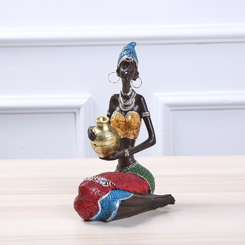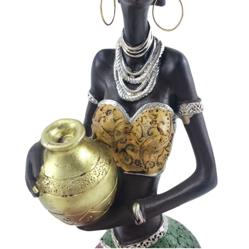 Apportez du charme dans votre décoration d'intérieur avec cette magnifique sculpture. Elle est fabriquée en résine naturelle et représente une jeune femme Africaine assise et qui porte une jarre dans ses bras. La tenue colorée du modèle ajoutera inévitablement de la bonne humeur et du dynamisme chez vous.