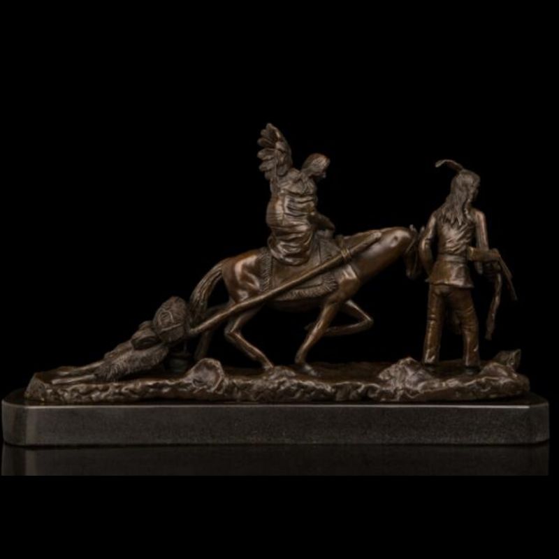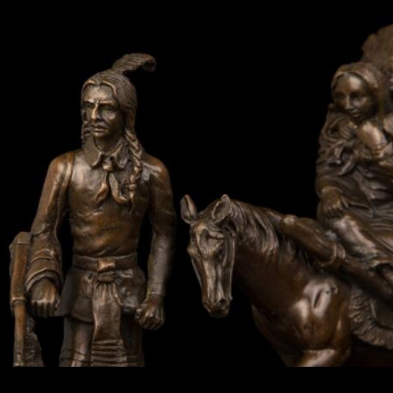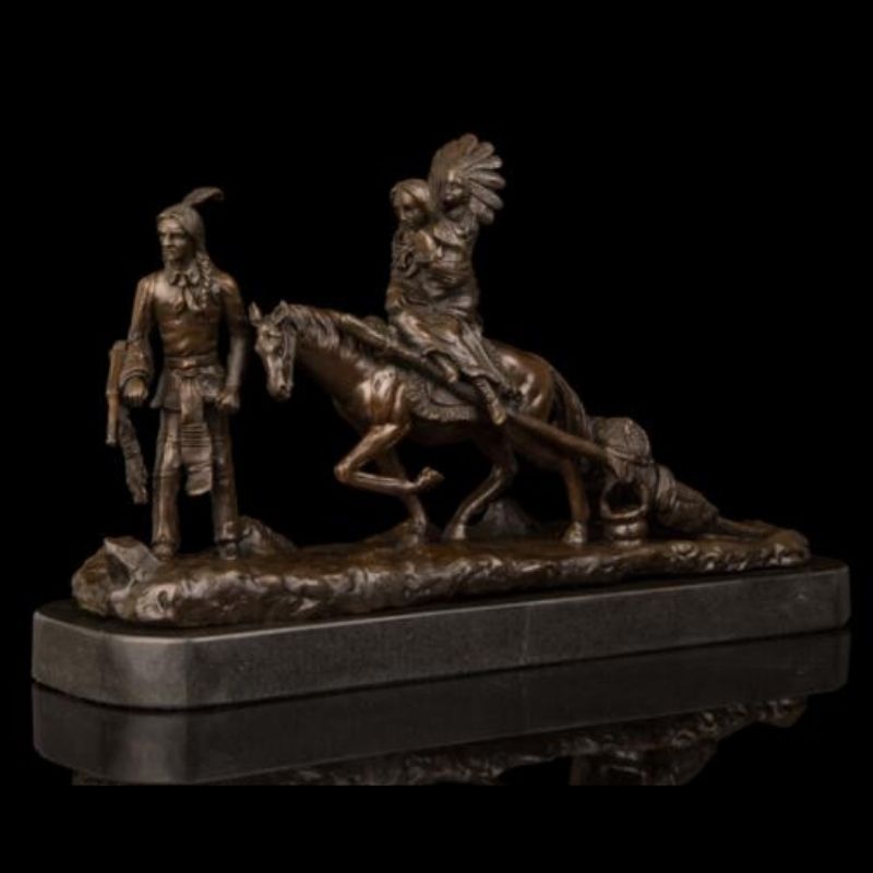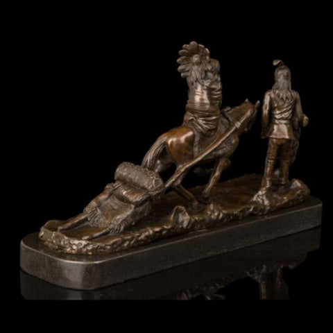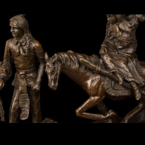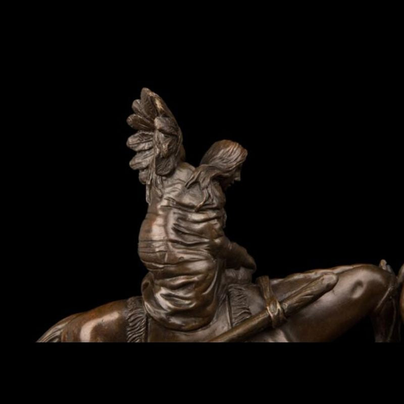Nous avons sélectionné rien que pour vous cette somptueuse sculpture fabriquée en bronze véritable. Cette œuvre unique apportera beaucoup de charme dans votre décoration d'intérieur. Elle représente un couple indien avec une femme sur le dos d'un cheval et l'homme qui les tire à l'avant. Sa couleur marron se mariera dans toutes les pièces de votre habitat.