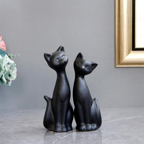 Vous ne pourrez pas résister face à ce duo de sculptures fabriquées en céramique. Elles représentent deux petits chats à l'allure élancée et élégante. Leurs couleurs noires apporteront beaucoup de charme dans votre décoration d'intérieur. Posez ces modèles sur une table de salon ou meuble d'entrée par exemple. Elles sont livrées en duo.