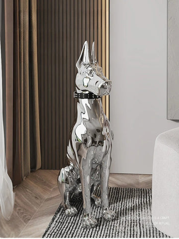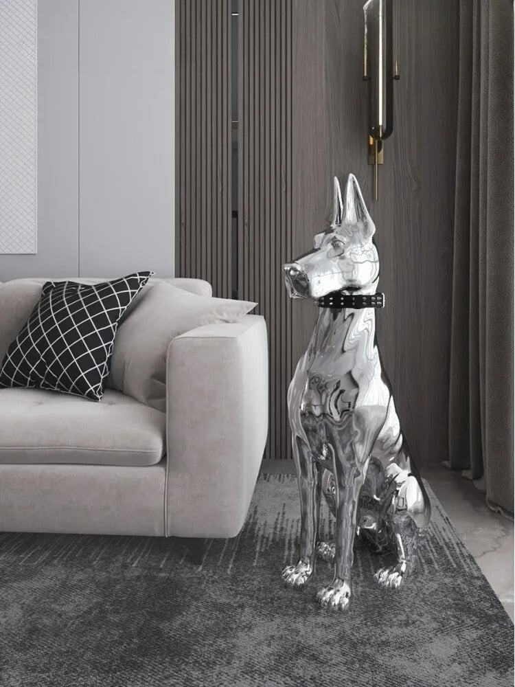 Imposez votre style avec cette majestueuse statue chien XXL, une pièce maîtresse qui ne manquera pas de captiver tous les regards. Cette sculpture chien design en finition chromée argentée incarne l'élégance d'un grand danois dans une posture noble et altière.