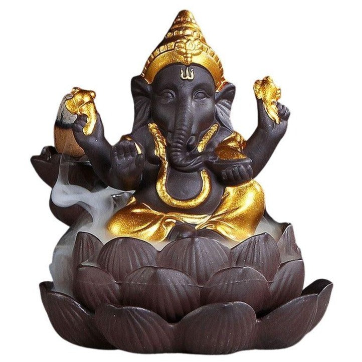 Cette sculpture représente Ganesh, le Dieu Hindouiste. Véritable symbole de bonheur et de succès, elle apportera de véritables bonnes énergies dans vos pièces. Ganesh est posé sur une fleur de Lotus qui représente la pureté spirituelle. Disposez de l’encens sur ce modèle pour disperser une délicieuse odeur.