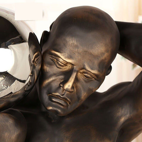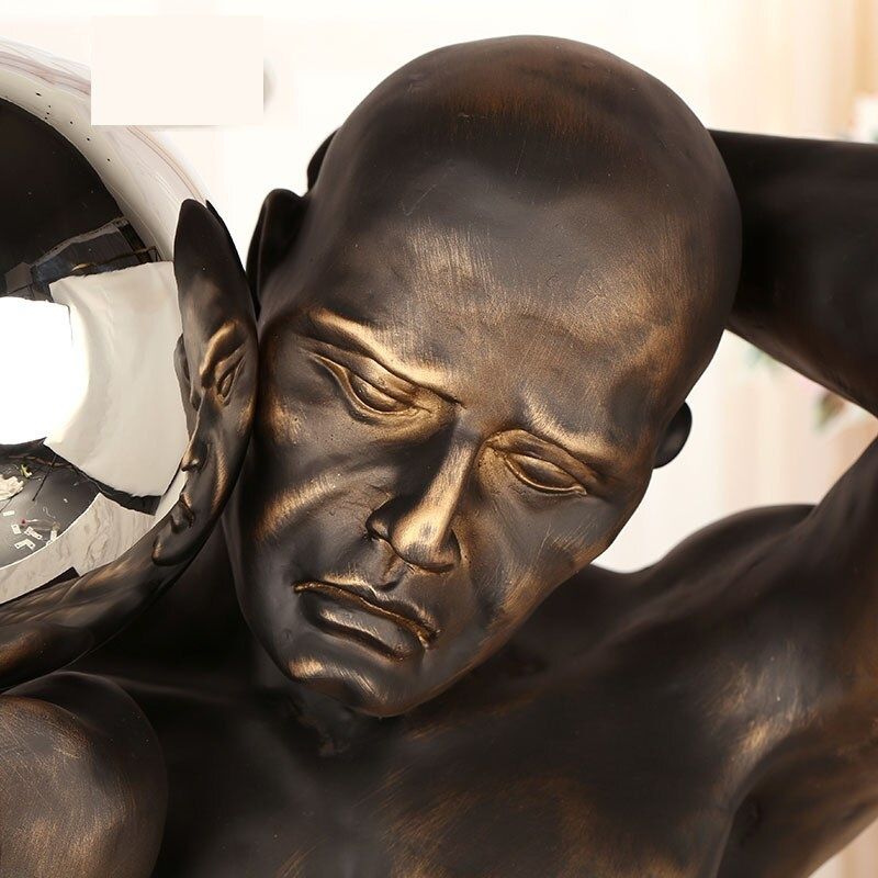 Cette magnifique sculpture est fabriquée en résine naturelle et métal et apportera beaucoup de charme et d'histoire au sein de votre décoration d'intérieur. Elle représente donc le buste d'une homme qui porte une balle effet miroir. Sa musculature est très représentative de la beauté de l'époque Gréco-Romaine. Sa couleur marron-doré se mariera très bien chez vous et donnera beaucoup d'énergie.