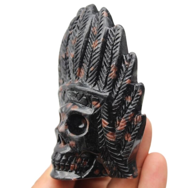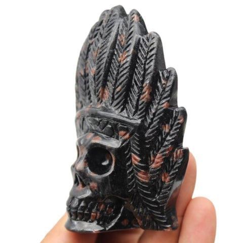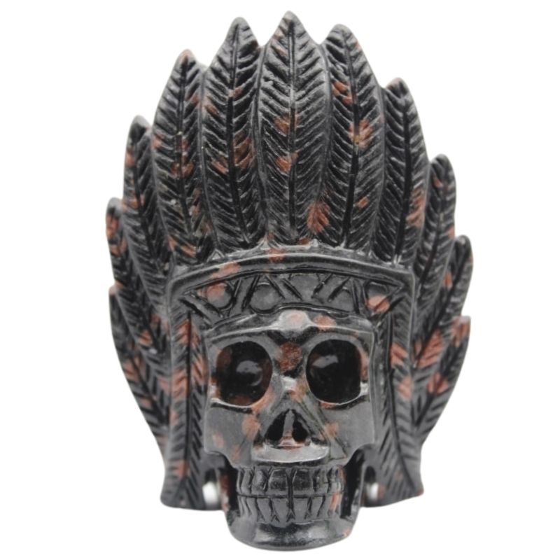 Vous aimez les têtes de mort et la culture Indienne? Alors cette sculpture sera parfaite pour vous ! Elle représente une tête de mort qui porte une coiffe amérindienne. Elle est sculptée en pierre de quartz cristal ce qui vous permet de décorer aussi bien votre intérieur que votre extérieur. Vous pouvez aussi bien la poser sur une table de salon, un meuble d'entrée ou sur votre table de chevet par exemple.