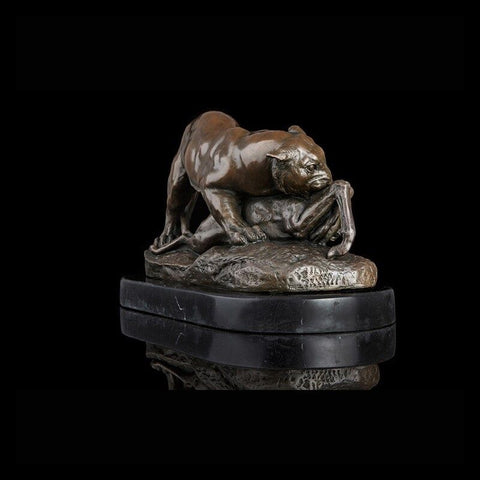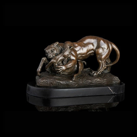 Une décoration d'intérieur ne serait pas terminée sans une très belle sculpture. Nous avons trouvé ce super objet décoratif fabriqué en bronze véritable. Elle représente une panthère entrain de chasser une antilope. La couleur marron brillante du modèle apportera beaucoup de cachet chez vous. Posez sur un socle noir magnifique, elle sera idéal dans votre salon par exemple.