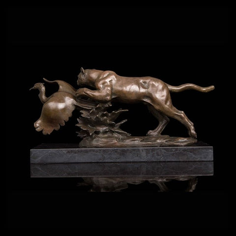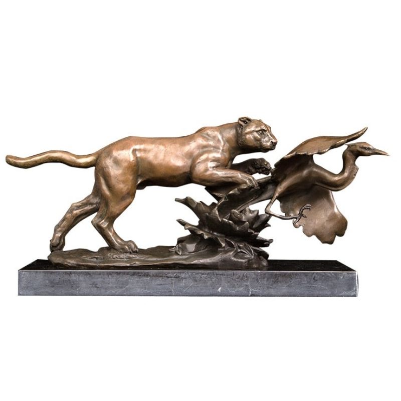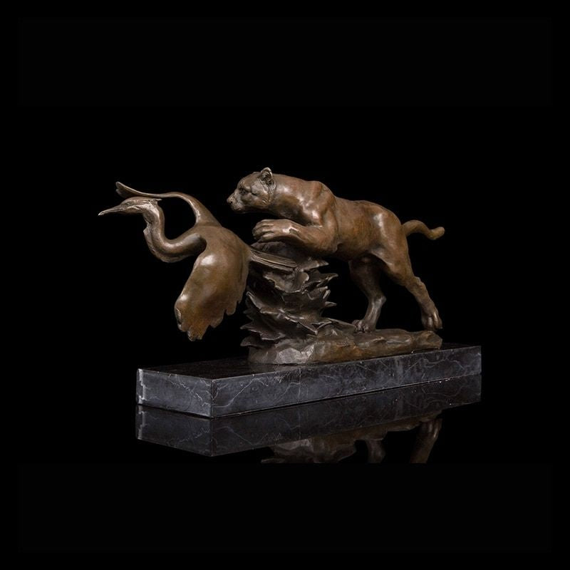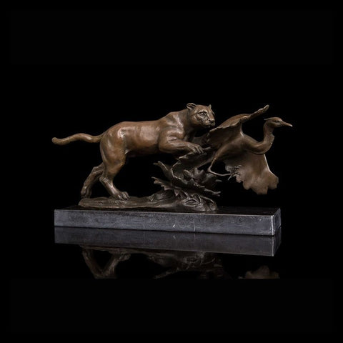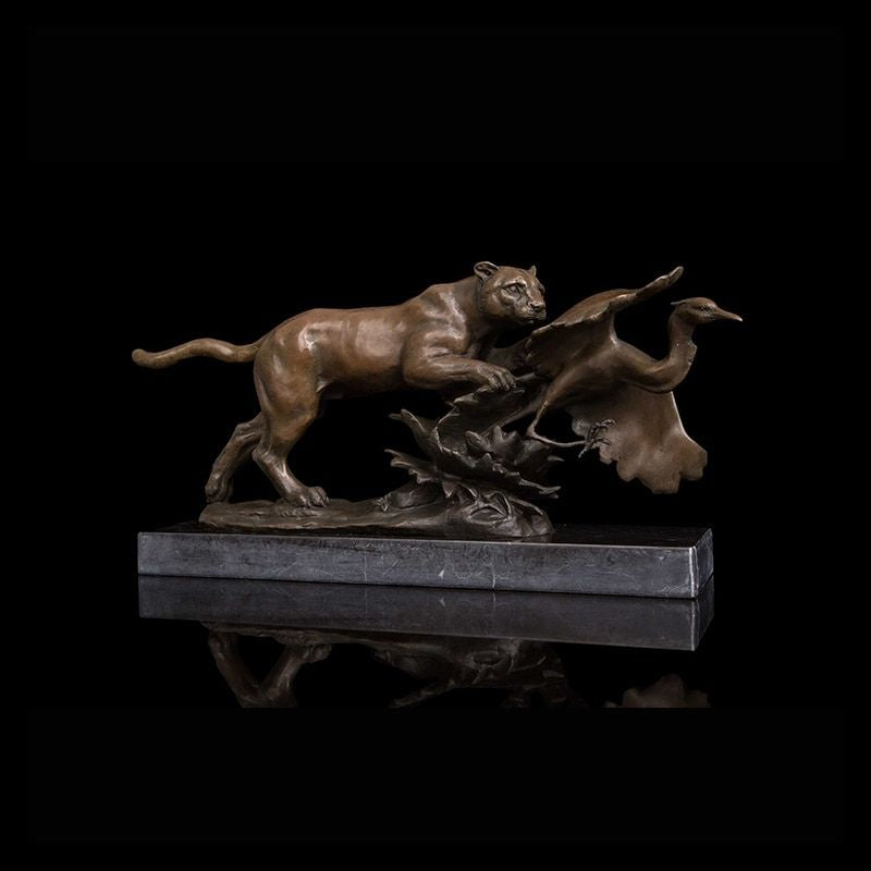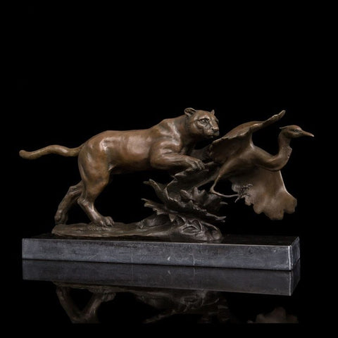 Cette superbe sculpture est un objet décoratif unique en son genre. Fabriquée en bronze, elle donnera beaucoup de charme dans votre décoration d'intérieur. La panthère qui attaque l'oiseau donnera beaucoup d'énergie et de puissance dans une pièce. Sa couleur marron réhaussera votre déco à merveille.
