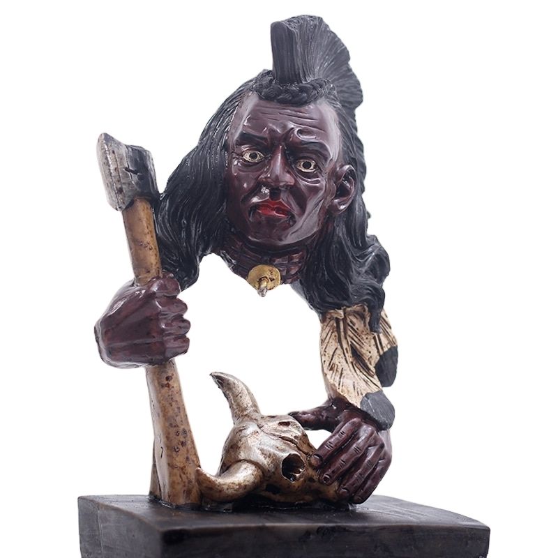 Nous avons sélectionné pour vous cette superbe sculpture fabriquée en résine naturelle. Elle représente un amérindien qui tient une hache dans sa main. Sa tenue est très traditionnelle et donnera beaucoup de charme au sein de votre décoration d'intérieur. Si vous aimez la culture Indienne, alors cette œuvre unique est faite pour vous ! Elle ira très bien sur une table de salon, un bureau ou un meuble d'entrée par exemple.