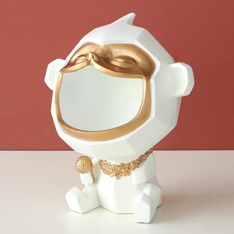 Laissez-vous tenter par cette magnifique sculpture fabriquée en résine naturelle. Sa forme géométrique est très tendance en ce moment et représente un petit singe. Ses couleurs blanche et or illumineront votre décoration d'intérieur à merveille. La tête du modèle est très grande ce qui vous permet d'y ajouter de petits objets comme des bonbons ou des clefs par exemple.