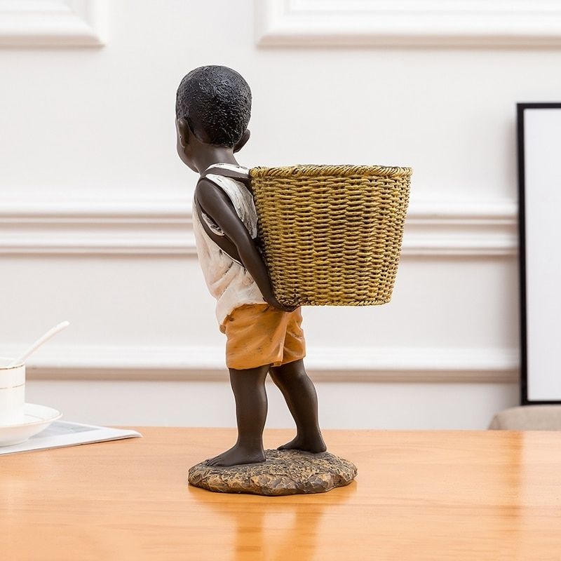 Accessoirisez votre décoration d'intérieur grâce à cette superbe sculpture fabriquée en résine naturelle. Elle représente un petit garçon portant un panier sur son dos. Sa forme vous permet d'ajouter de petits objets à l'intérieur pour un aspect plus pratique. Ce modèle est fabriqué en résine naturelle et saura décorer votre pièce de vie à merveille.