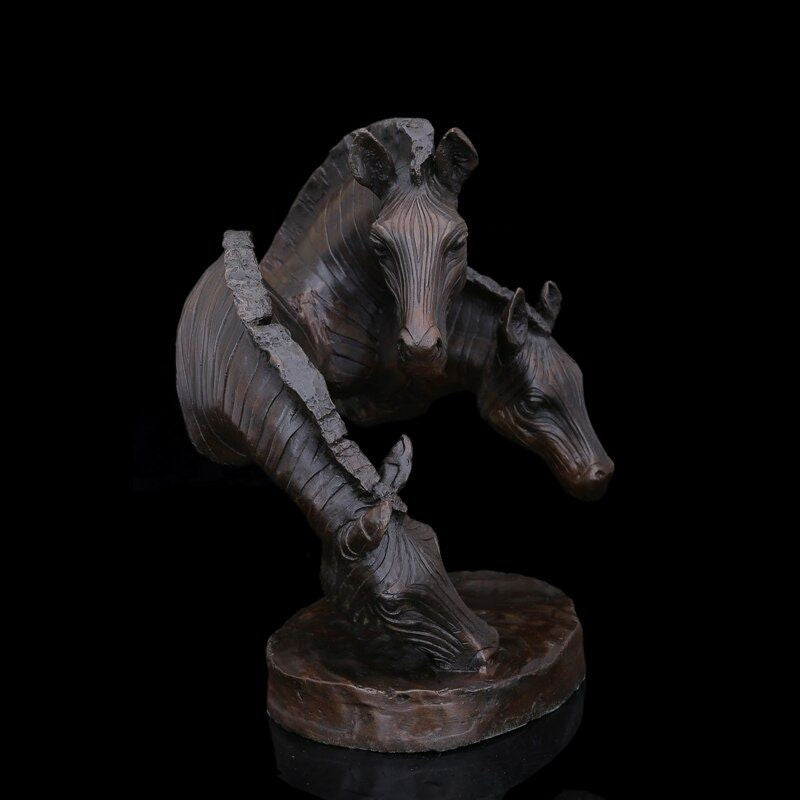 Vous cherchez un objet décoratif qui a beaucoup de cachet et qui ne passera pas inaperçu chez vous ? Nous avons ce qu'il vous faut ! Cette magnifique sculpture est fabriquée en bronze et représente trois têtes de zèbres entrain de boire. Les têtes de ces animaux ont l'air de tenir toutes seules ce qui apporte beaucoup d'originalité au modèle. Elle sera parfaite posée sur un meuble de salon ou d'entrée par exemple.