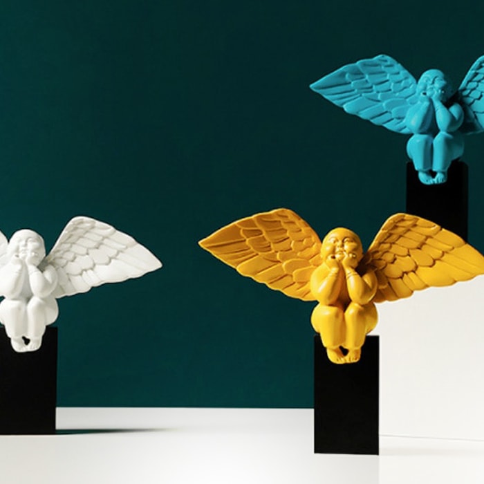 Cette sculpture apportera de l'originalité et de la couleur à votre décoration d'intérieur. Elle représente un ange l'air farceur assis avec de grandes ailes. Vous avez le choix entre plusieurs coloris pour mettre du peps dans votre habitat. Ce modèle original apportera de la gaieté dans votre intérieur.